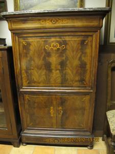 Refined Charles X secretaire inlaid with mahogany feather.Dark marble upper shelf . Excellent condition. It is possible to change the shelf's leather.